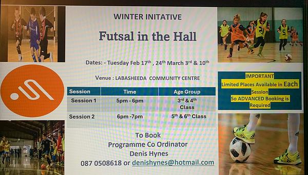 See below link for winter activity futsal in the hall that will be hosted in Labasheeda Community Centre on Tuesdays starting Feb 17th.